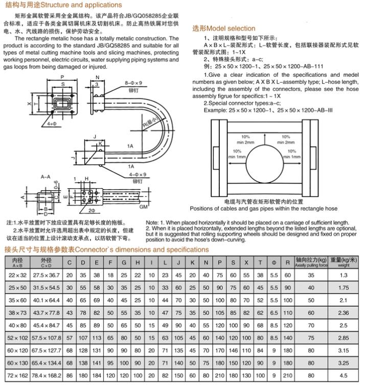 結(jié)構(gòu)與用途:矩形金屬軟管采用全金屬結(jié)構(gòu)。該產(chǎn)品復合JB/GQ058285企業(yè)聯(lián)合標準,適應于各類金屬切屑機床及切割機床。防止高熱鐵屑對您供電、水、汽線路的損傷,保護勞動安全。