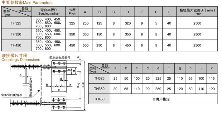 3.TH特大堅(jiān)固鋼拖鏈**大限度的改進(jìn)了拖鏈的受力情況,時(shí)拖鏈的使用壽命可達(dá)往復(fù)運(yùn)行30萬次以上。