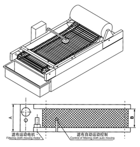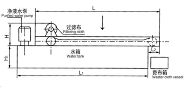 紙帶過濾機是由液箱、集污箱、過濾無紡布/紙帶、減速機、傳動結(jié)構(gòu)、發(fā)訊結(jié)構(gòu)、液泵等幾部分組成。