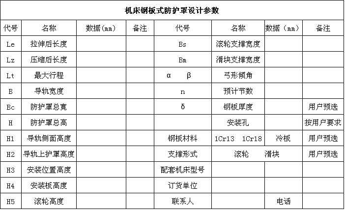 注:1.用戶訂貨時只要填明以上數(shù)據(jù),選定材料,我公司代為設(shè)計制造。1.用戶訂貨時只要填明以上數(shù)據(jù),選定材料,我公司代為設(shè)計制造。3.每種防護(hù)罩填寫一張。如樣本不夠,可復(fù)印填寫。4.對非標(biāo)準(zhǔn)型的鋼板式防護(hù)罩附導(dǎo)軌及滑鞍截面圖。